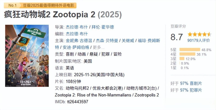 看起来,《疯狂动物城2》的内地首周票房就有望突破10亿人民币了。
