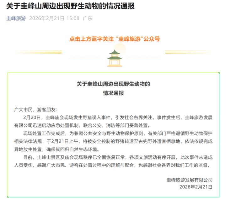 2月20日,圭峰庙会现场发生野猪误入事件,引发社会各界关注。事件发生后,圭峰旅游发展有限公司迅速启动应急处置机制,联合公安、消防等部门妥善处置。