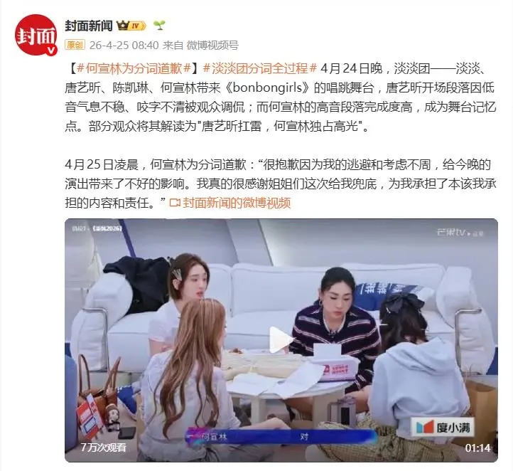 争议来得快,回应更快。4月25日凌晨,何宣林在社交平台发文道歉,语气诚恳且直接:“很抱歉因为我的逃避和考虑不周,给今晚的演出带来了不好的影响。我真的很感谢姐姐们这次给我兜底,为我承担了本该我承担的内容和责任。”她没有回避问题,而是主动把“逃避”和“考虑不周”这两个关键词摆上了台面,承认自己在分词环节上的处理不够成熟,让队友替自己承担了压力。